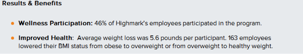 ShapeUp’s Case Study of Highmark employees’ weight-loss program. Highmark is a 19,600-employee Blue Cross health plan headquartered in Pittsburgh, PA.