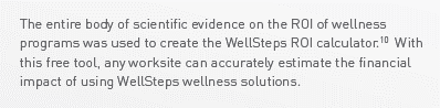 “At Wellsteps, we’ve created a series of research-based ROI calculators to help you estimate the effect of well-designed wellness programs on health care costs, absenteeism, and presenteeism. Each of the three ROI calculators will examine a different employee expense and will help you determine whether investing in wellness strategies makes sense for your company. A well-designed wellness program is one that changes the health behaviors of employees, spouses, and dependents, and lowers health risks, reduces chronic disease, and helps worksites create a culture of health. The design of the WellSteps turnkey wellness solution was based partly on this body of evidence.”