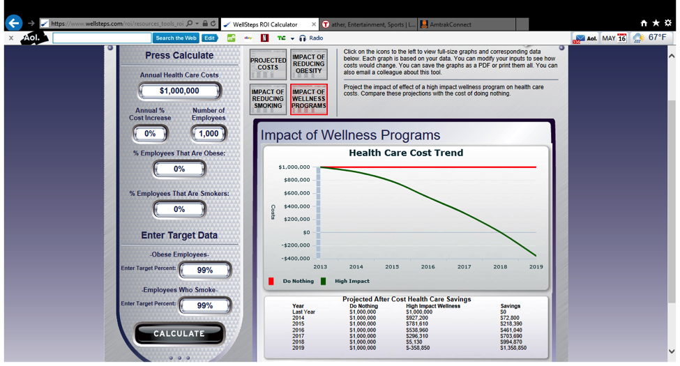 Wellsteps ROI Calculator . You input your number of employees, health spending, and goals for obesity and smoking cessation. The calculator will tell you how much money you can save through the Wellsteps program.