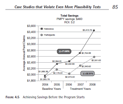 But we can’t identify anywhere near 100% of the employees who have chronic disease. Absent that perfect information, any fifth grader could understand the proof that this methodology is fabricated, as follows. Assume that 10 people with a chronic disease cost $10,000 apiece both in the baseline and in the study period. Their costs are therefore flat. The program did not reduce costs between periods.