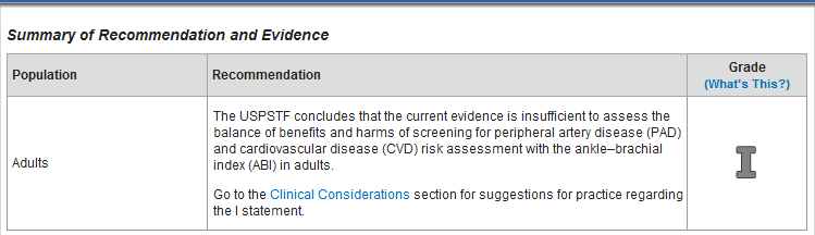 By earning another “I”, the peripheral artery disease test does well by HealthFair’s standards. The USPSTF concludes that researchers don’t know enough about it to recommend it, which doesn’t stop HealthFair.