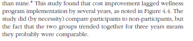 Comparing to an “expected” trend is one of the most effective sleight-of-hand techniques in the wellness industry arsenal. Every single published study in a wellness promotional journal comparing results to “expected trend” has found savings. And have you ever hired a consultant or vendor to compare your results to “expected trend” who hasn’t found “savings”? We didn’t think so.