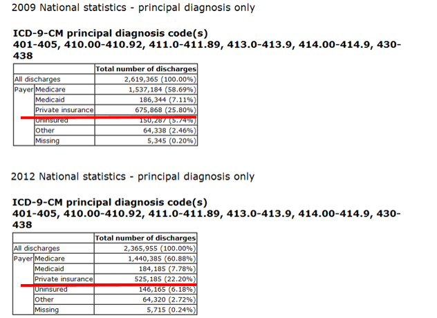 The problem is that, according to US Government data below, this set of IVD events declined everywhere over the same 3-year period by– as luck would have it– that very same 23%. Don’t believe us? Here is the data. The comparable group on the display below is the “privately insured” cohort, underlined in red, now that we have figured out how to do underlines on screenshots. (Even Medicare, where there is no workplace wellness and where the population grew almost 10% and aged quite a bit, showed a decline in IVD of almost 10%.)