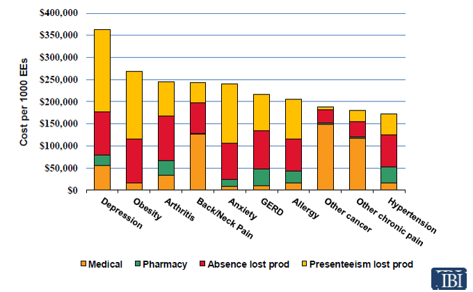 Al – one clarifying point on the research graph (and I’d be happy to send you a copy of the research paper if you like). It is a person-centric analysis rather than an analysis of the marginal impact of individual diseases (parsing out the marginal impact in this kind of data is extraordinarily difficult). We wanted to look at the experience of PEOPLE with different conditions (and because of the prevalence of co-morbidities tend to have other conditions as well). So as you point out, you don’t miss work because of high-cholesterol but those with high cholesterol often have other conditions that together cause them to miss work. Tom