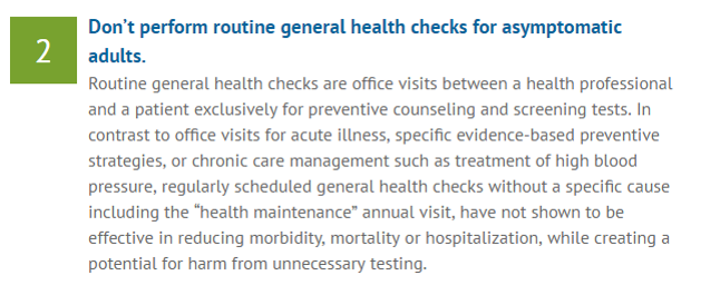 Checkups are included in Choosing Wisely’s compendium of low-value services. Along with Choosing Wisely (a joint venture of Consumer Reports and the American Board of Internal Medicine), there’s the New England Journal of Medicine and the Journal of the American Medical Association.