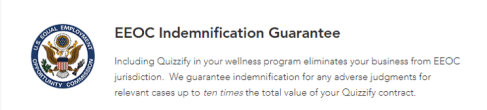 - We know of no other vendor that solves the problem and guarantees the solution, with EEOC indemnification. Quizzify was both conceived and architected in anticipation that this court decision would happen someday. (I just didn’t expect it to happen four days before Christmas, which meant a lot of my cousins got gift cards instead of ugly sweaters.) All my exposes on the wellness industry led me to conclude that conventional “wellness or else” (as Jon Robison calls it) could never survive a court challenge…and I designed a product specifically to allow employers to address that challenge immediately and completely.
