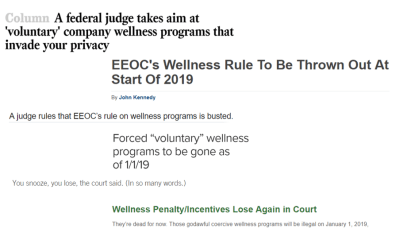 Let’s review what’s happened so far in 2018. First, a federal judge ruled that voluntary wellness programs need to be — get ready — voluntary. The EEOC’s responded with the legalese equivalent of: “Fine, be that way.”