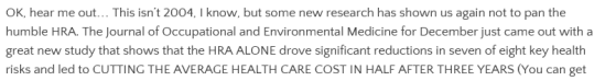 …to support the proposition that HRAs cut the average health care cost in half after three years. Or, to use his exact words, CUT THE AVERAGE HEALTH CARE COST IN HALF AFTER THREE YEARS.
