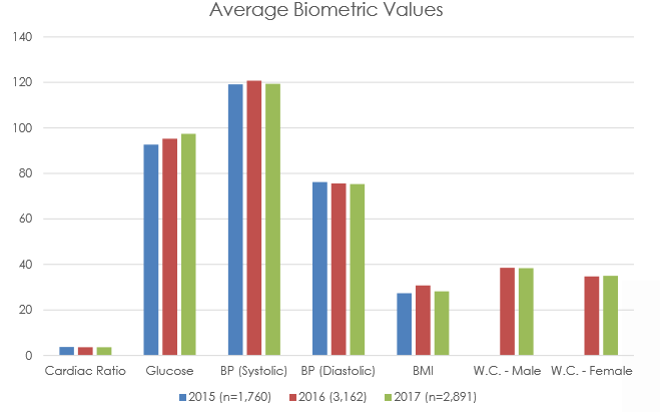 BMI and glucose got worse. Somehow, blood pressure stayed the same — 120 over 75. Yes, despite the average employee being almost prediabetic, and sporting a 40-inch waist for males (and close to that for females), pretty much everyone in this company has ideal blood pressure. One explanation for this would be that Provant, whatever their shortcomings in weight control, are the world’s leading experts in all things cardio. (And that’s even before they started — when everyone in this company already had ideal blood pressure.)