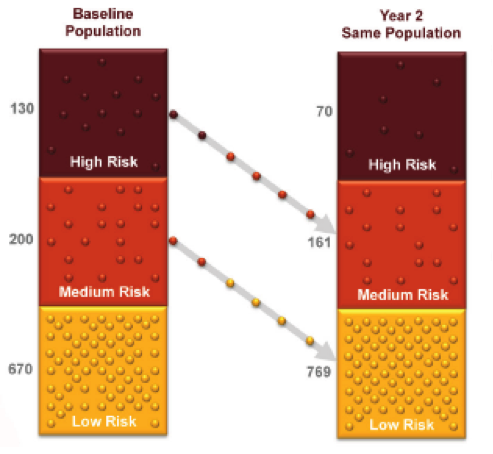 Pretend not to notice that low utilizers can show an increase in utilization — or especially that low-risk people can increase in risk. Focus the mark (I mean, the customer) on the high-risk people who decline in risk. Never draw graphs to scale, or your customer might notice that 2/3 of their employees are low-risk in the first place.