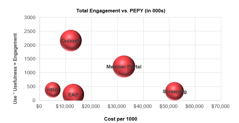 The VI has also created the single most elegant, easily implemented, and valid tool to measure the cost-effectiveness of various benefits. No tool has ever done that at all, let alone freely and easily. You simply ask employees “How many times if at all did you use this benefit?” and “Was it useful?” Multiply those two scores together to get an engagement index and graph that against the cost of the benefit. The most cost-effective benefits will demonstrate high engagement at low cost, in the upper left. (The size of the bubble scores an optional third question: “Does offering this benefit enhance corporate culture?”)