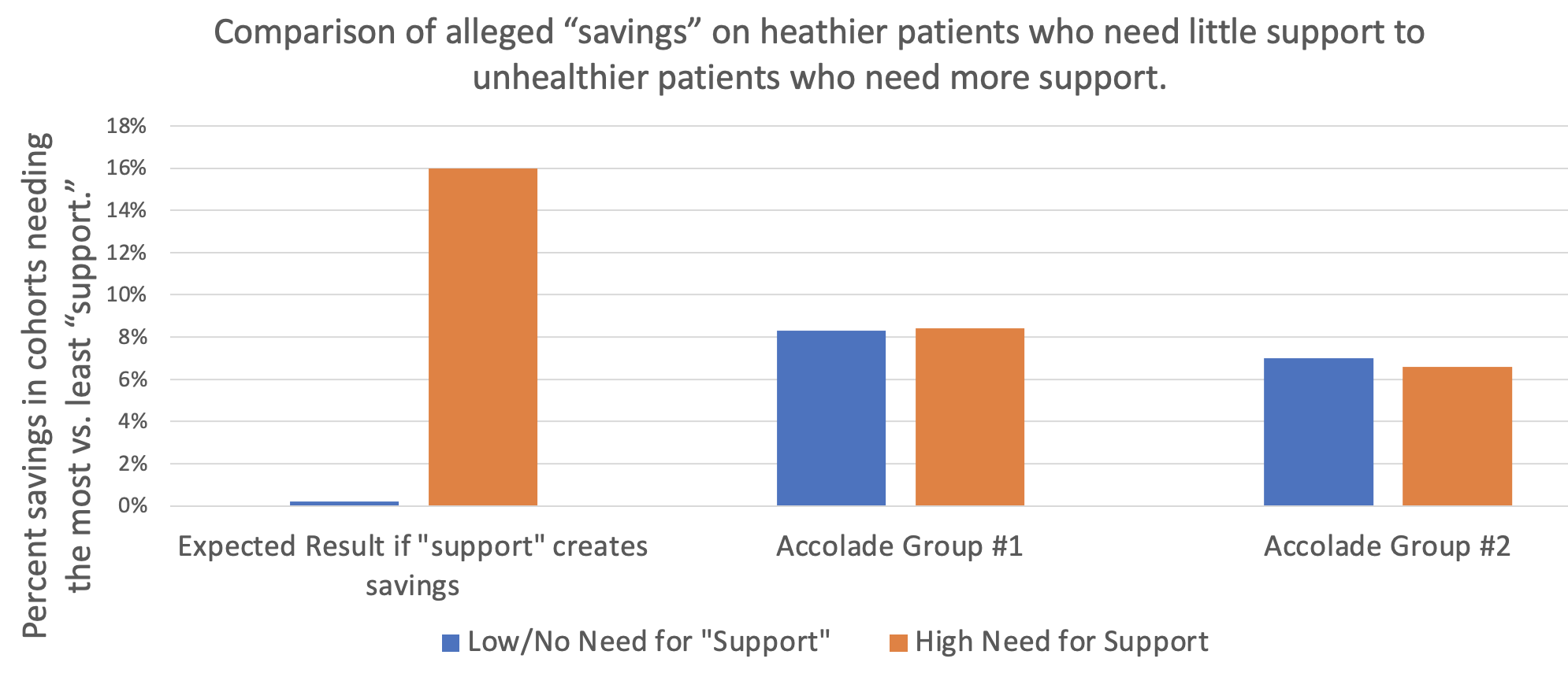 However, the reverse turns out to be true: in neither Accolade group “studied” by Aon did what we will term the “support-sensitive” cohorts (high-acuity) outperform the no/low-acuity cohort – people who would mostly have no reason to seek support. One would expect the opposite. Compare the expectation on the left to the reality in the two sets of bars on the right, showing no net savings (even a negative variance) for the support-sensitive cohorts vs. the cohorts not needing support, in both groups studied: