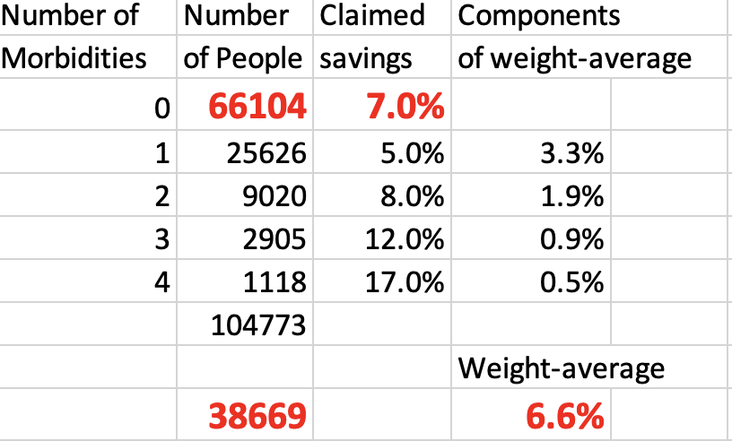 Also, I am not an expert in SEC regulations, but I think they would need to disclose that their front-page go-to “validated” and “rigorous” savings claim analysis is incorrect because the 5 categories of morbidity are averaged instead of weight-averaged.*