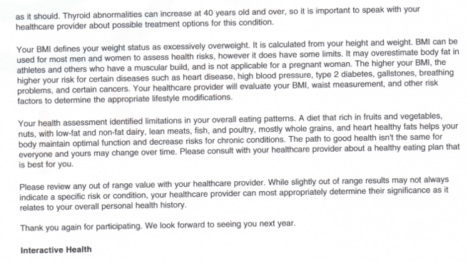 Fortunately, most employees will have the good sense to ignore their advice, if for no other reason than it is quite a Herculean task to plow through it all. How do I know this? By definition, any employee reading this blog is more health-conscious than average. And yet the particular employee who, after reading my blog post on them, sent me this letter originally sent me only the first and third page. She hadn’t even realized there was a second page, since Interactive Health printed it on the back of the first page.