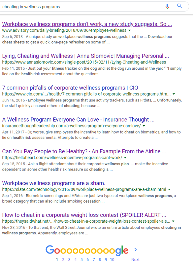 It turns out that the source of these click-throughs is indeed “search engines.” Seems that even though the target audience for this posting was the narrow HR/benefits community, employees themselves are googling on “cheating in wellness programs” and finding this post right on the first page of hits: