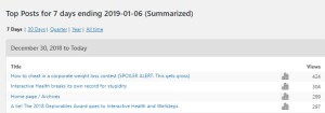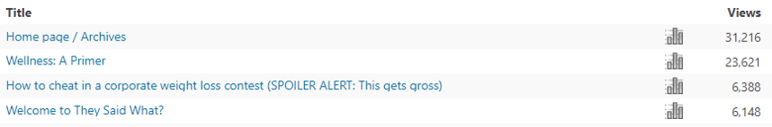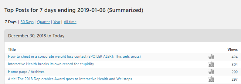 Here are the 2019 stats through yesterday.. A new cycle of wellness programs and crash-dieting contests is about to start, so despite New Years week being a very slow week for TSW (like other HR blogs), that post is #1: