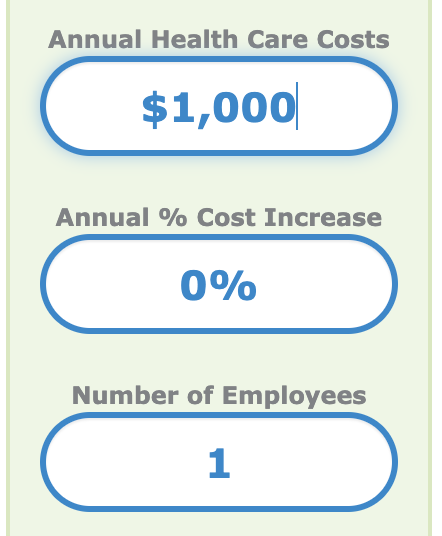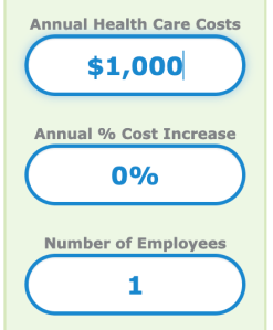Start by zeroing out inflation as a confounder (“0”). Then, for simplicity and consistency, enter “1” into number of employees, as below. I entered $1000 into annual healthcare costs, just to use a round number.