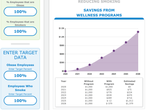 Let’s see how much they save in the best-case scenario. Enter 100% into the two fields “% Employees that [sic] are obese” and “% Employees that [sic] are smokers.”