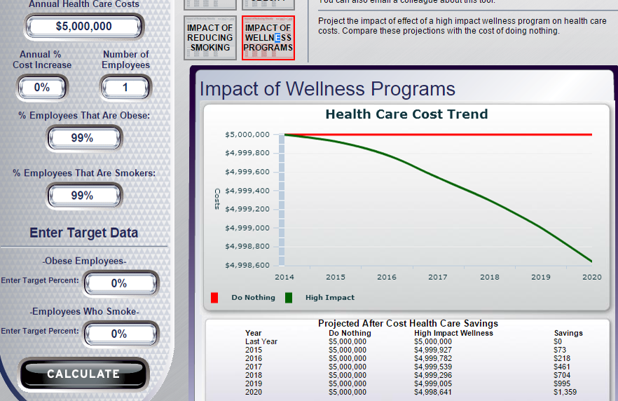 And here you saved $1359 even though there was nothing to save. The costs are as low as the model will allow you to enter (until they got caught, you could enter figures low enough that they model would calculate negative costs), and there was no smoking or obesity to reduce: