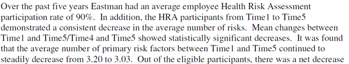 Success at risk reduction and translation of that risk reduction into cost savings. These excerpts are from the successful Koop Award application at http://www.thehealthproject.com/documents/2011/EastmanEval.pdf.